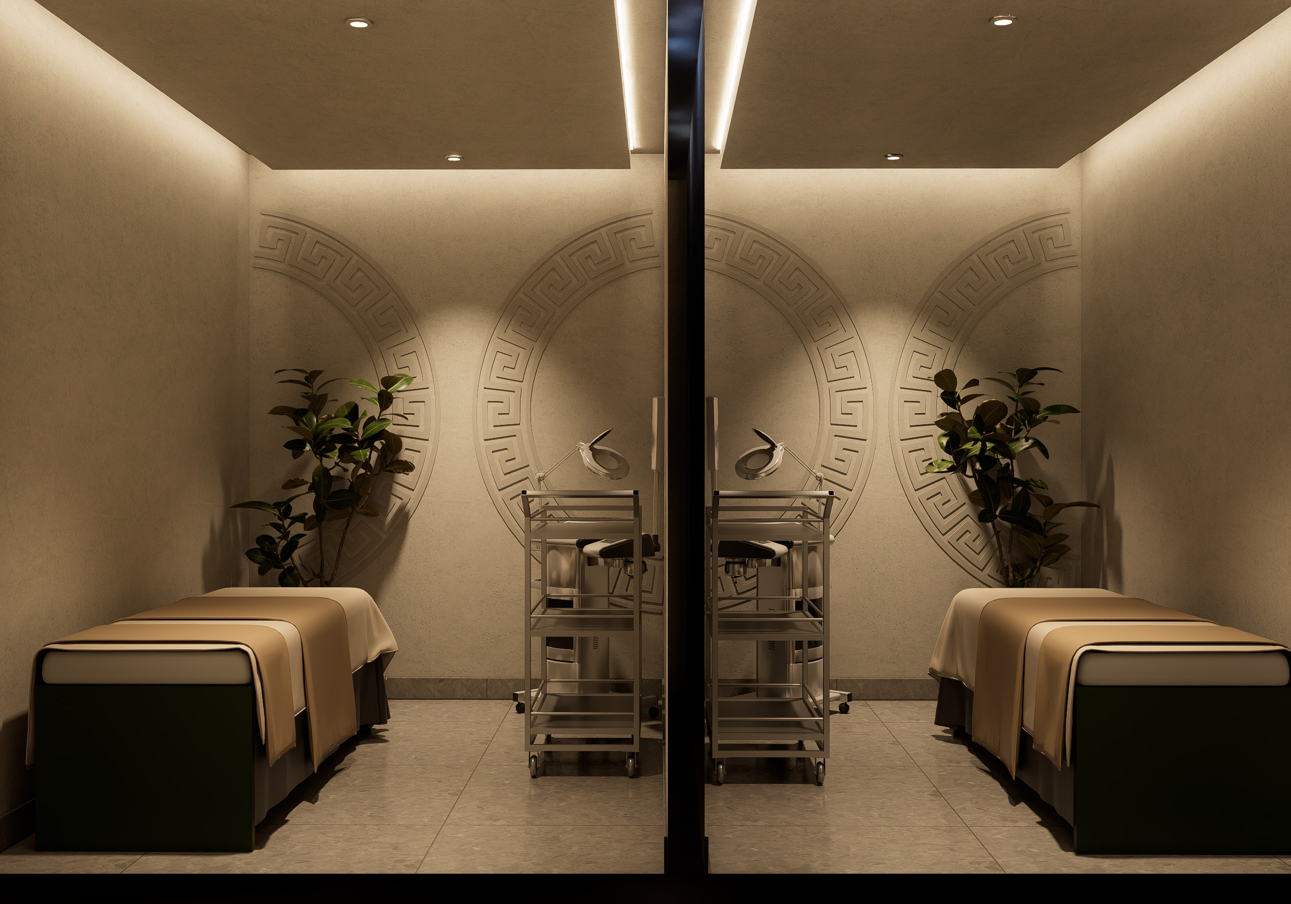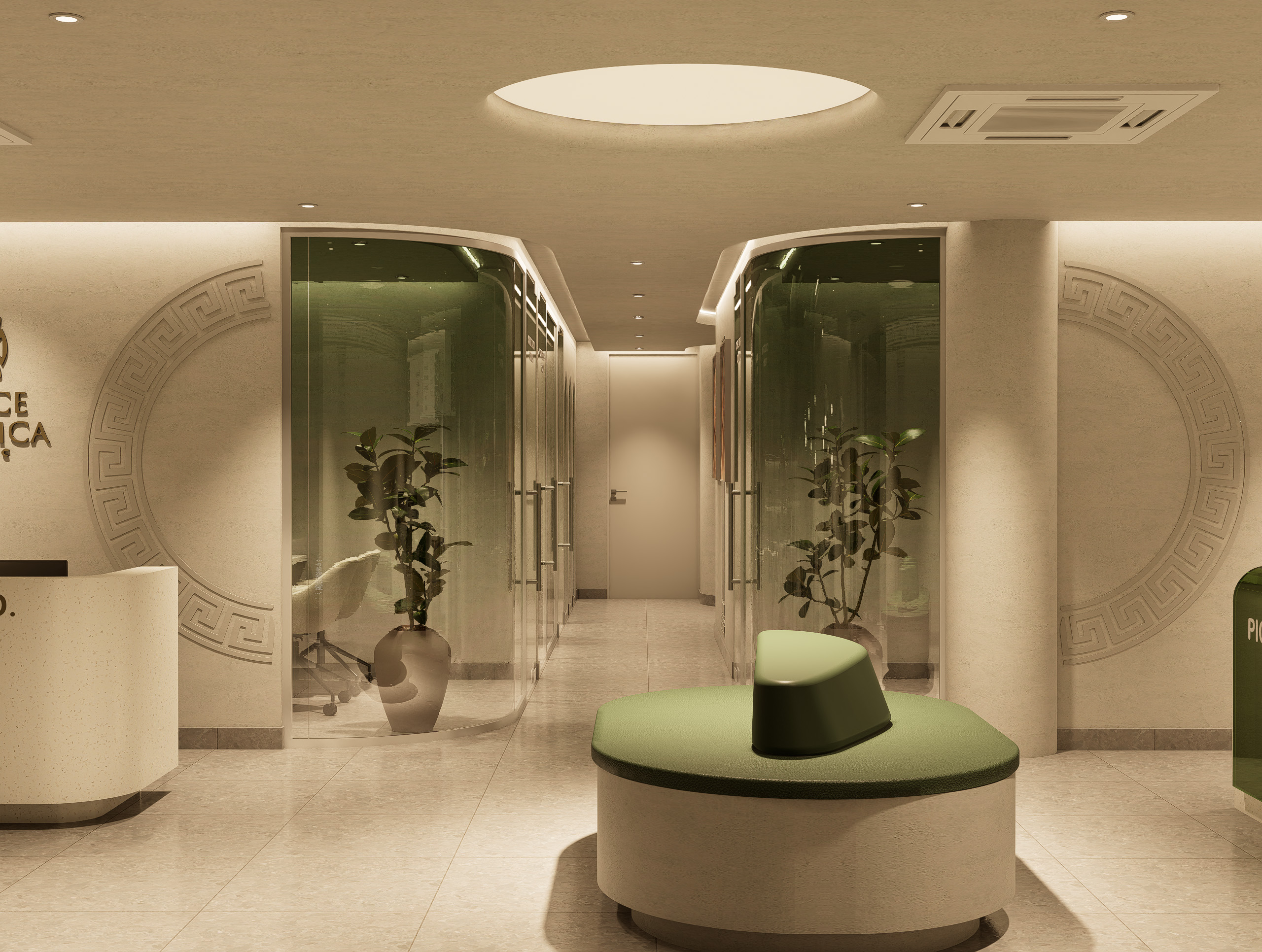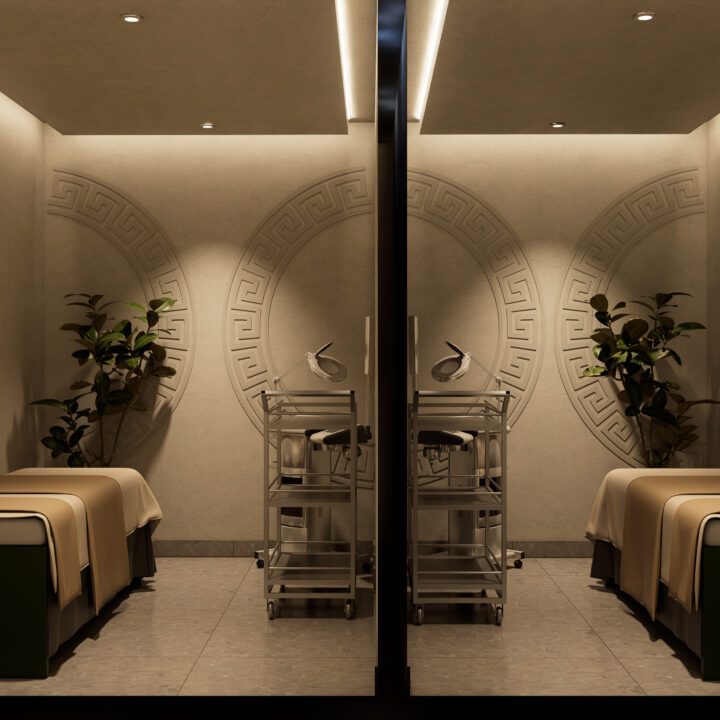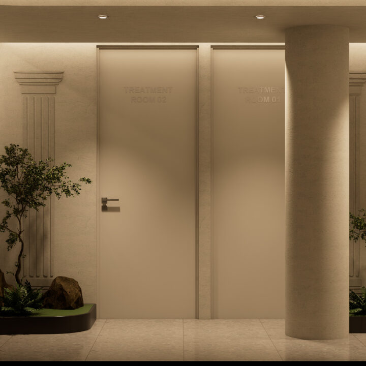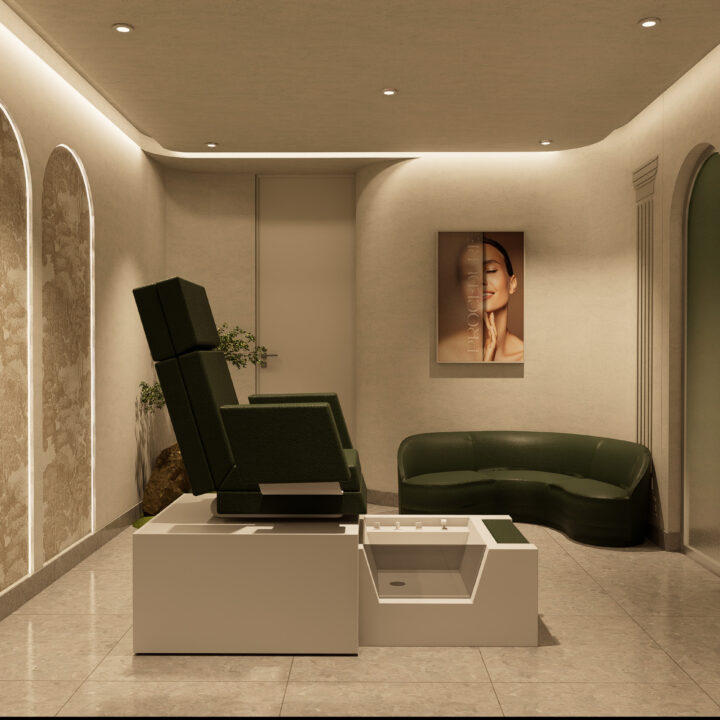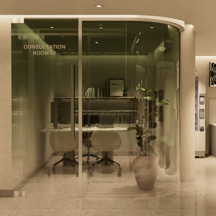 • Subtle brand accents on walls, mirrors, and display accessories