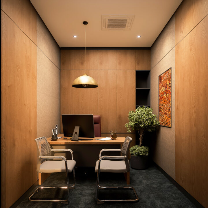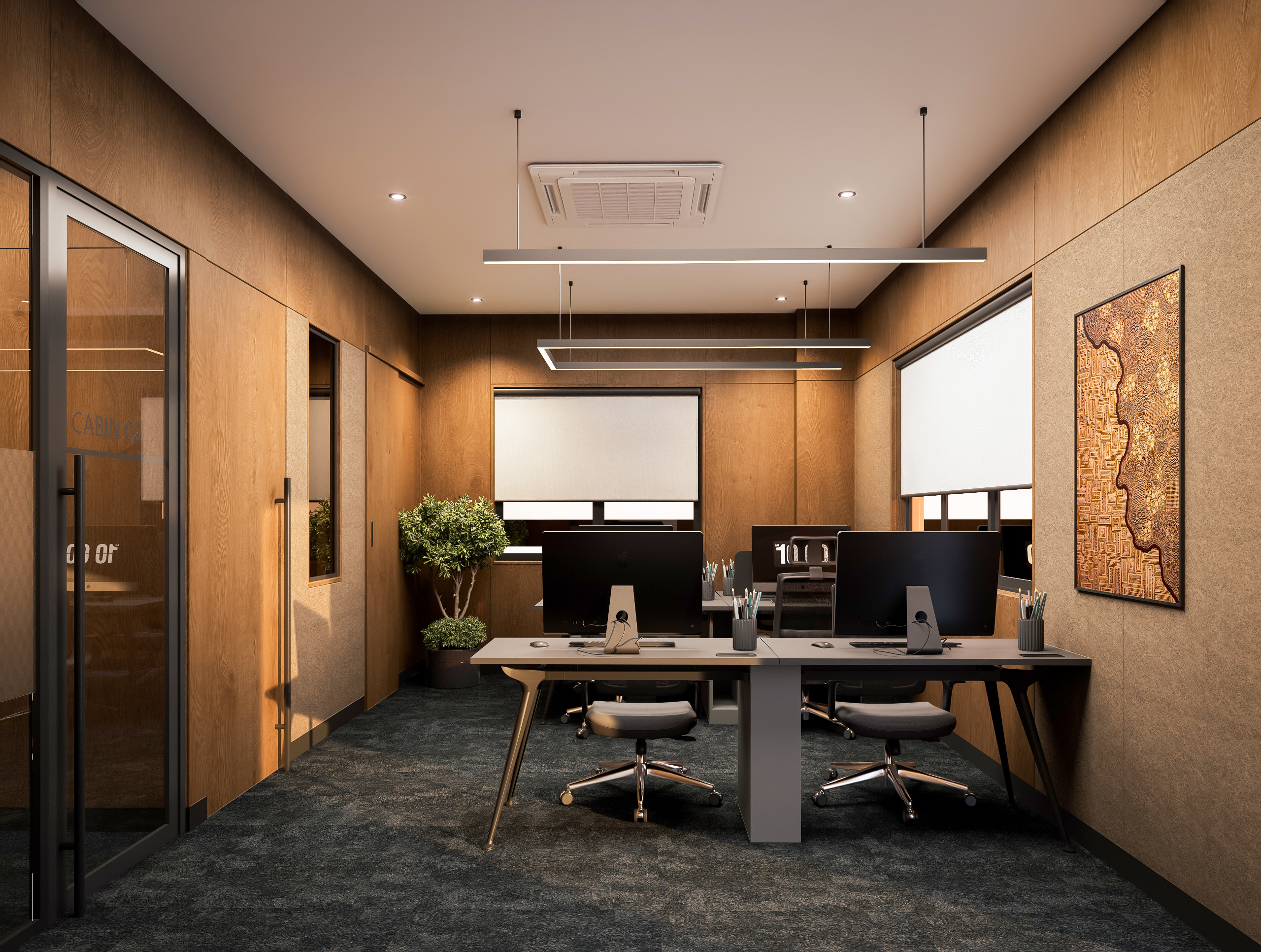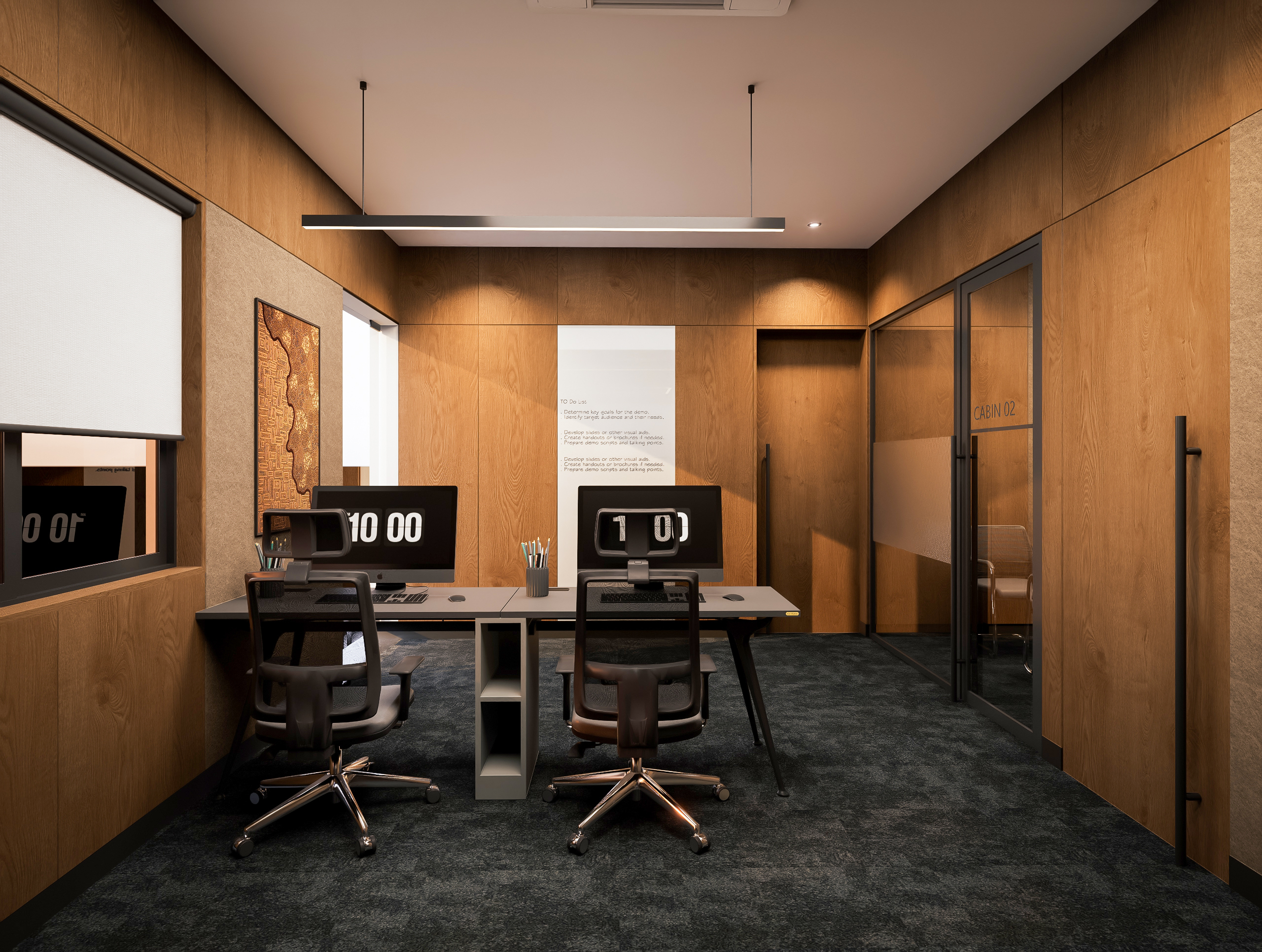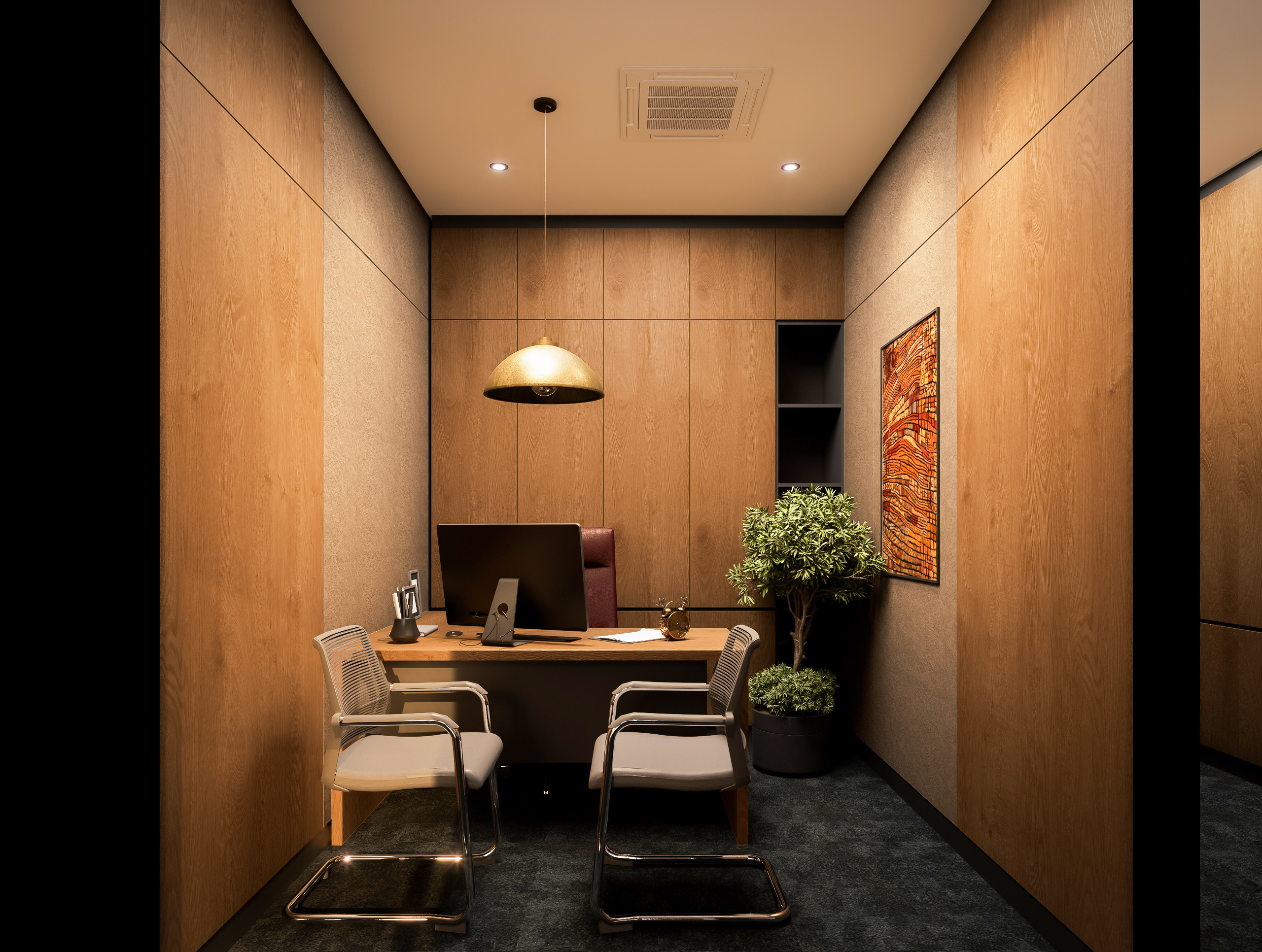 The executive cabins are designed with a focus on privacy, productivity, and comfort. Wooden wall paneling, soft textured finishes, statement lighting, and minimal furniture detailing create an elegant workspace that feels both professional and inviting.