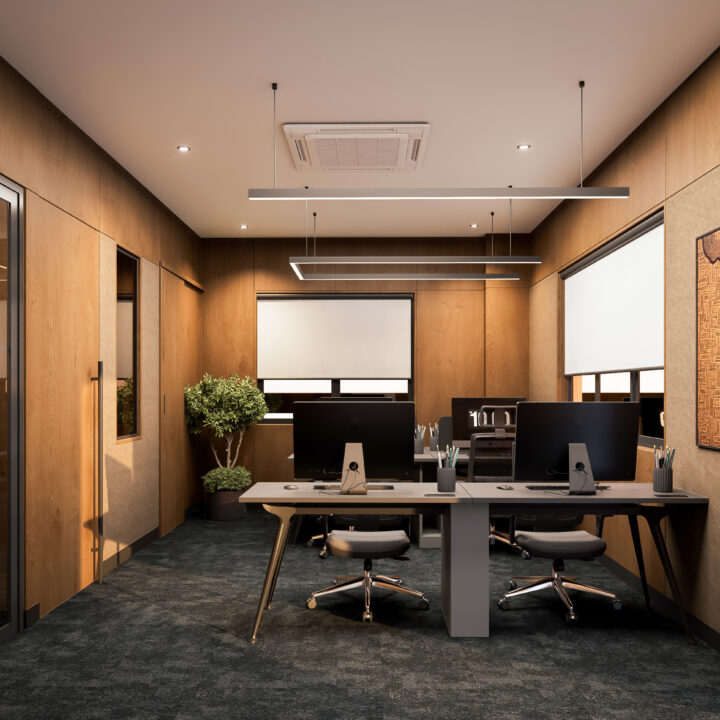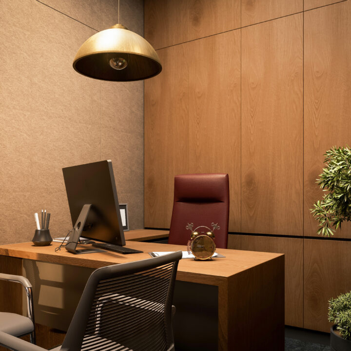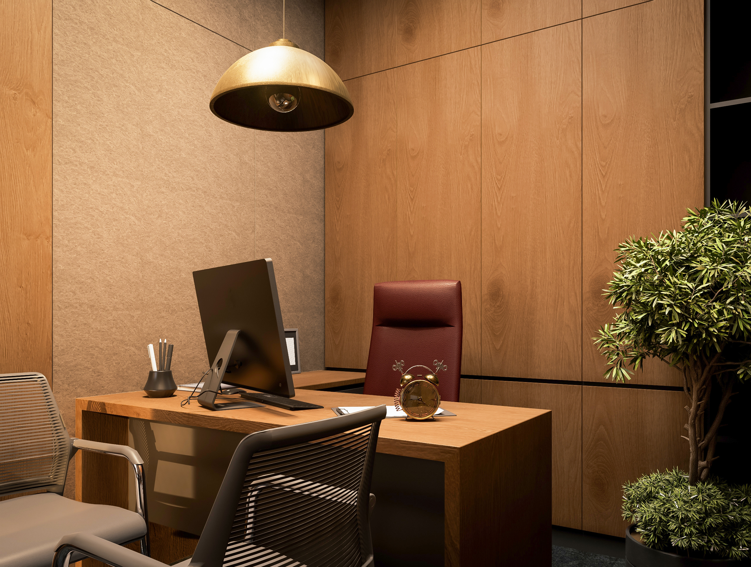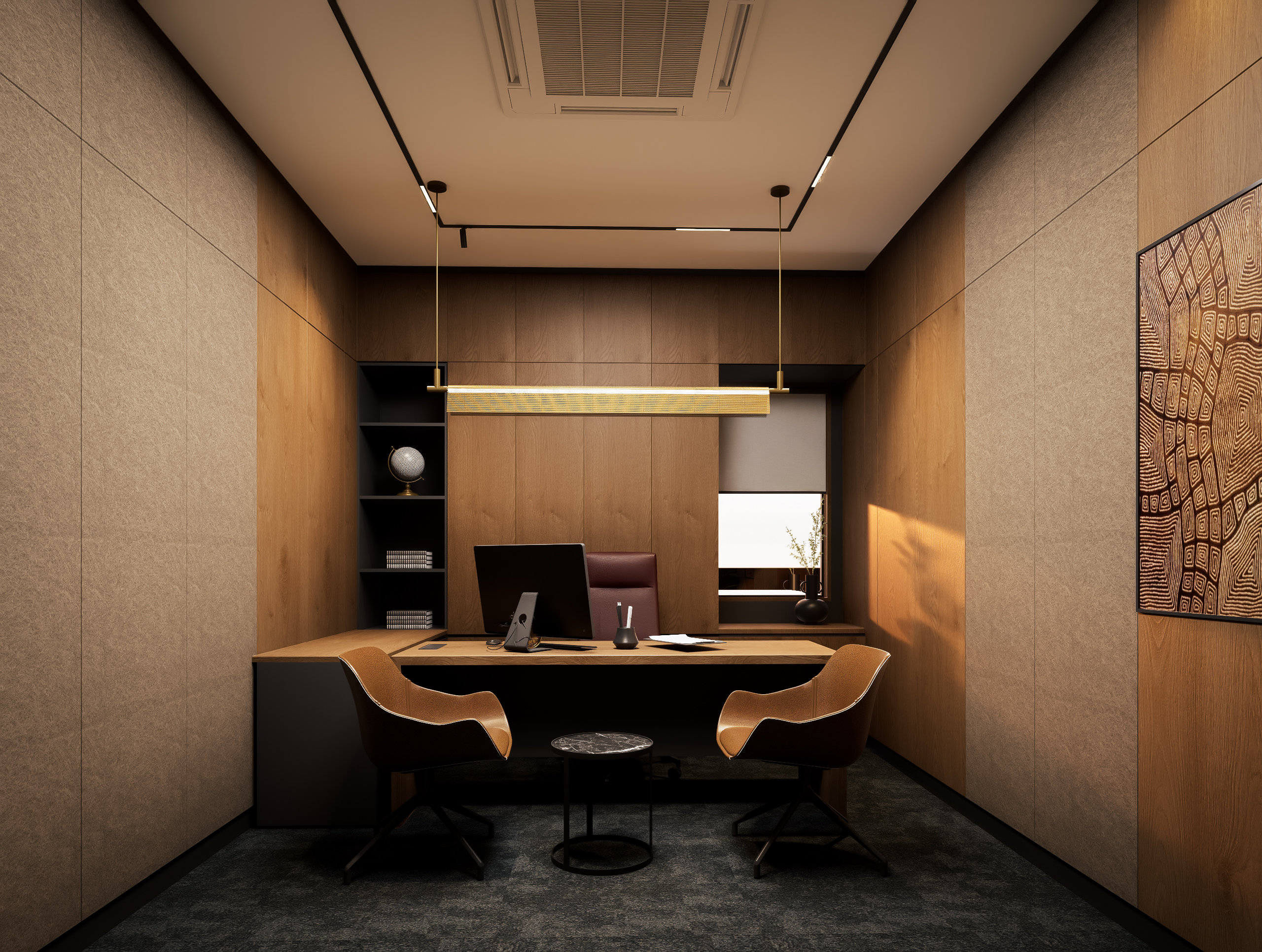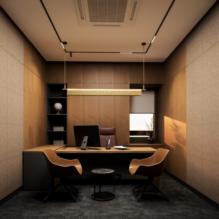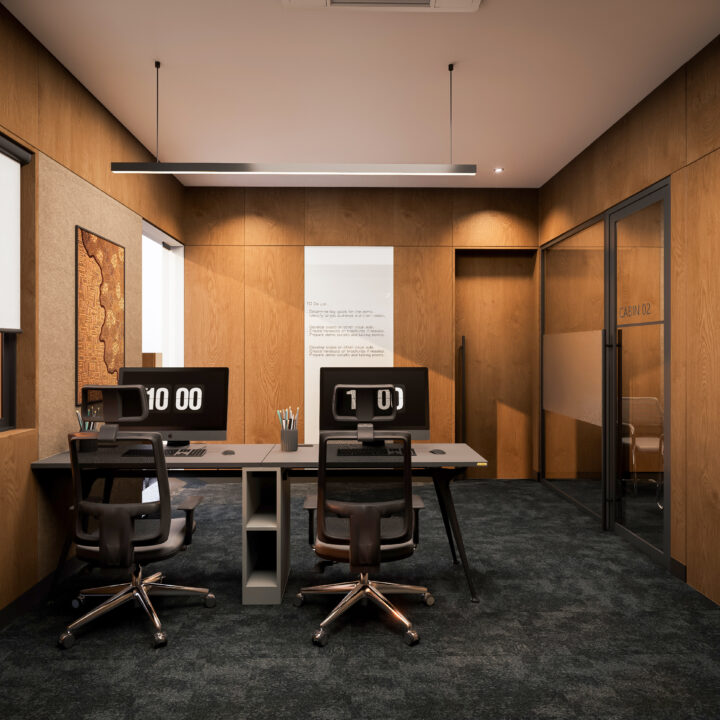 The executive cabins are designed with a focus on privacy, productivity, and comfort. Wooden wall paneling, soft textured finishes, statement lighting, and minimal furniture detailing create an elegant workspace that feels both professional and inviting.