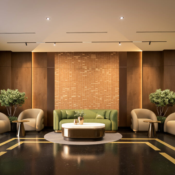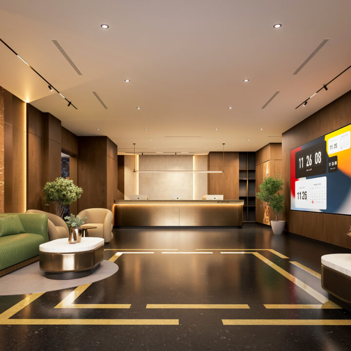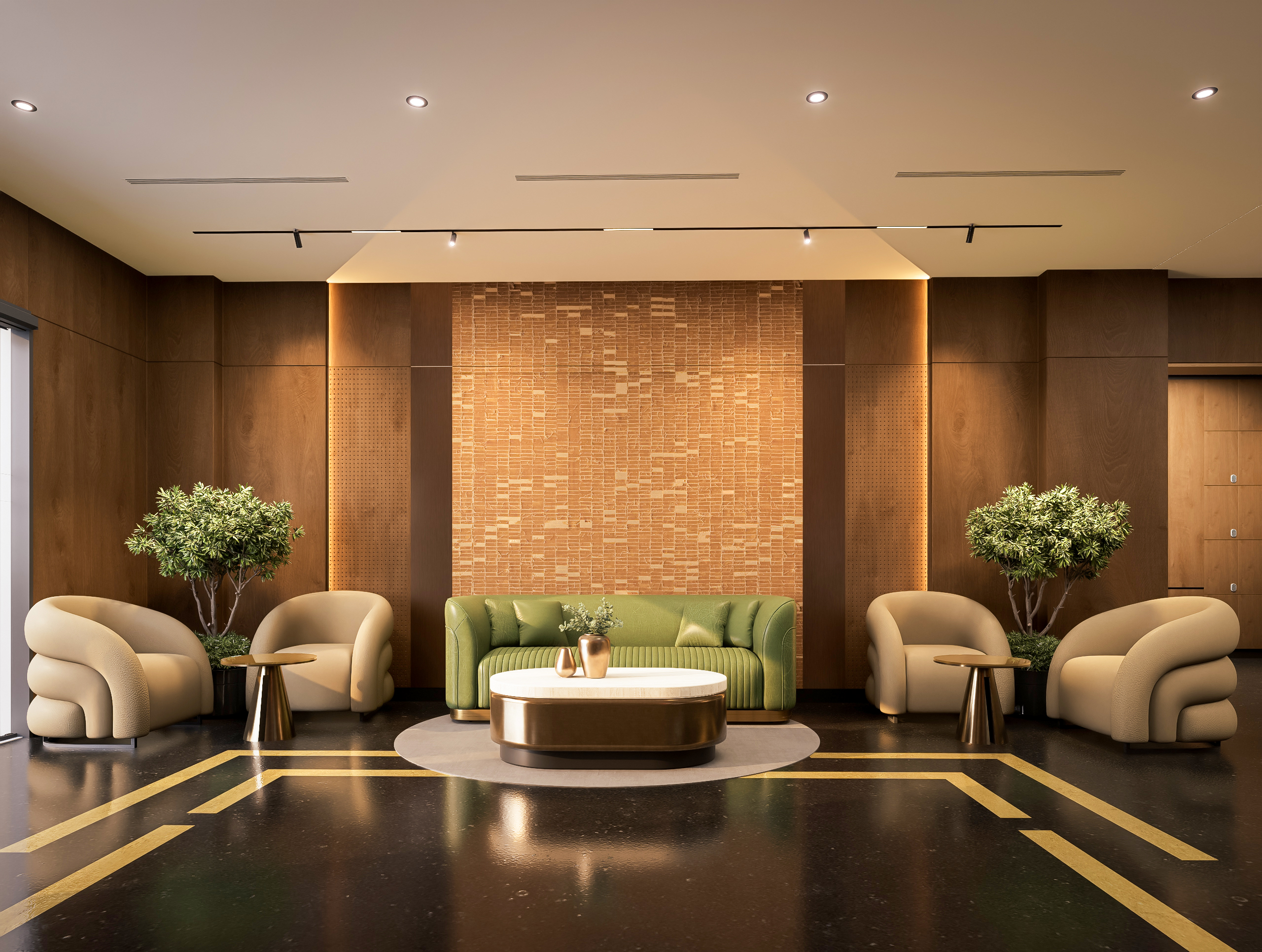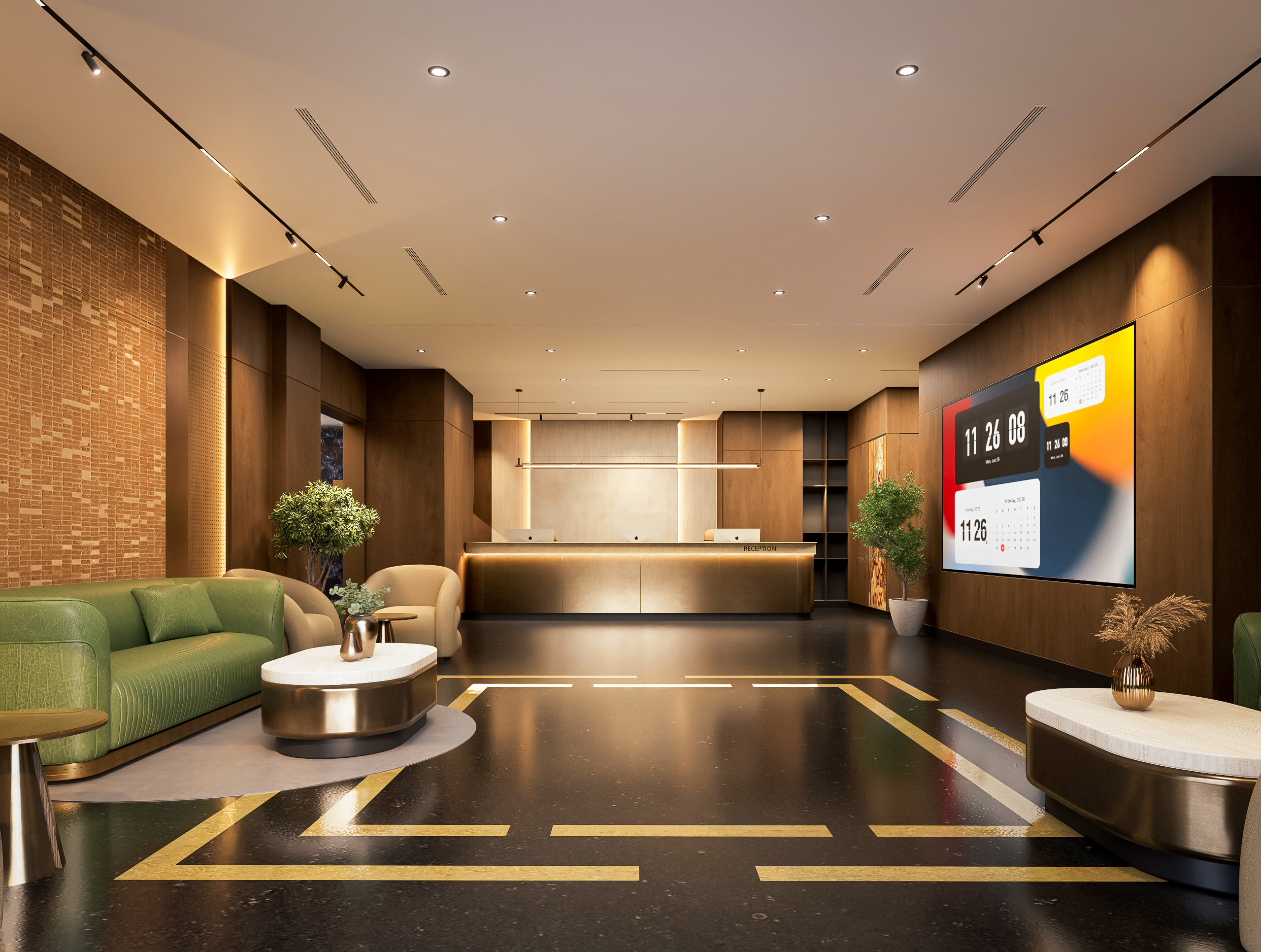 The reception is designed as a premium arrival space with a clean, illuminated front desk and branded backdrop that establishes a strong first impression. The waiting lounge features elegant seating, warm lighting, and carefully selected materials to create a comfortable and sophisticated visitor experience.