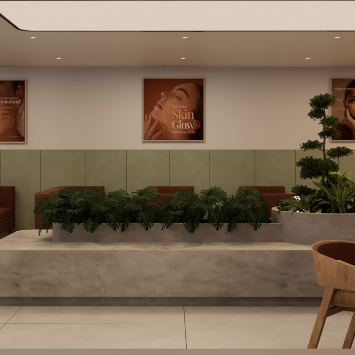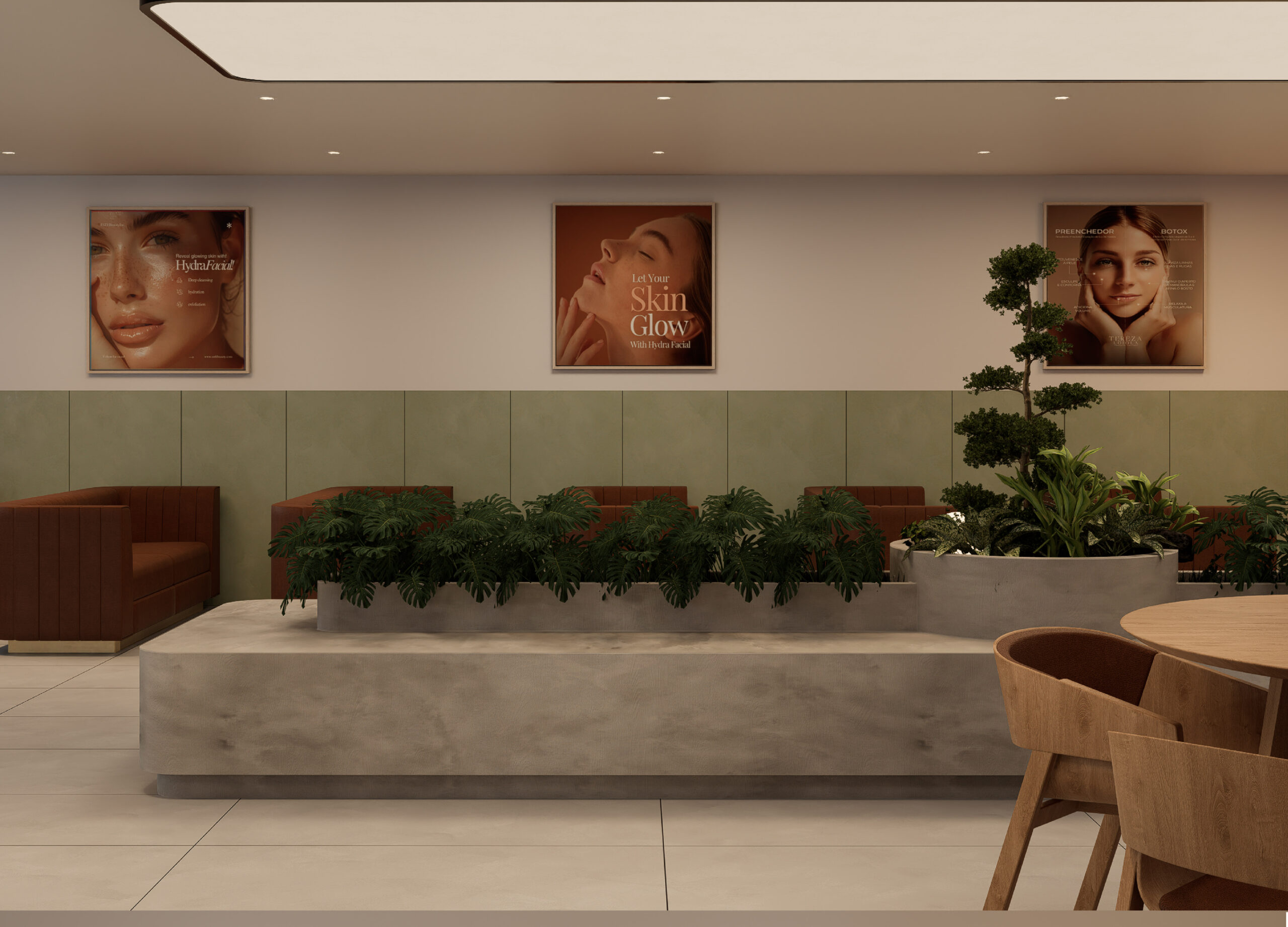 The dermatology and consultation areas follow a minimal and professional design language with subtle luxury.