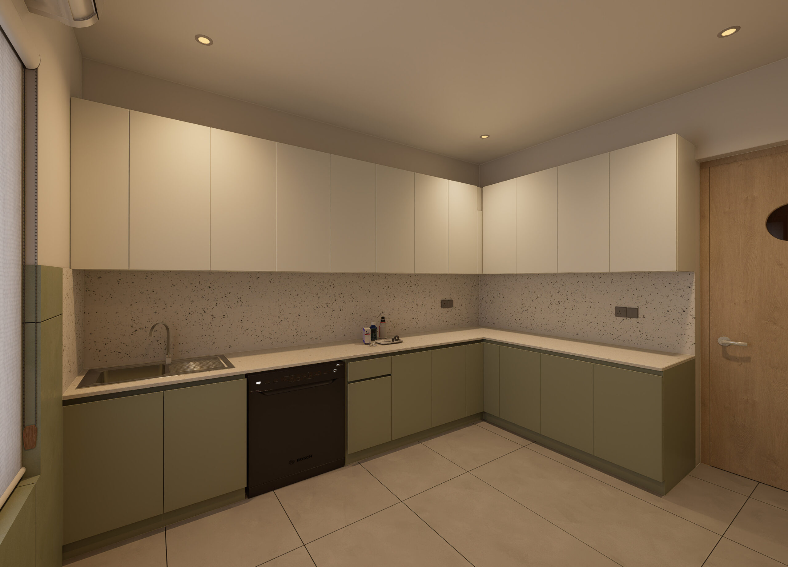 - Soft sage green lower wall panels to create warmth and reduce visual monotony