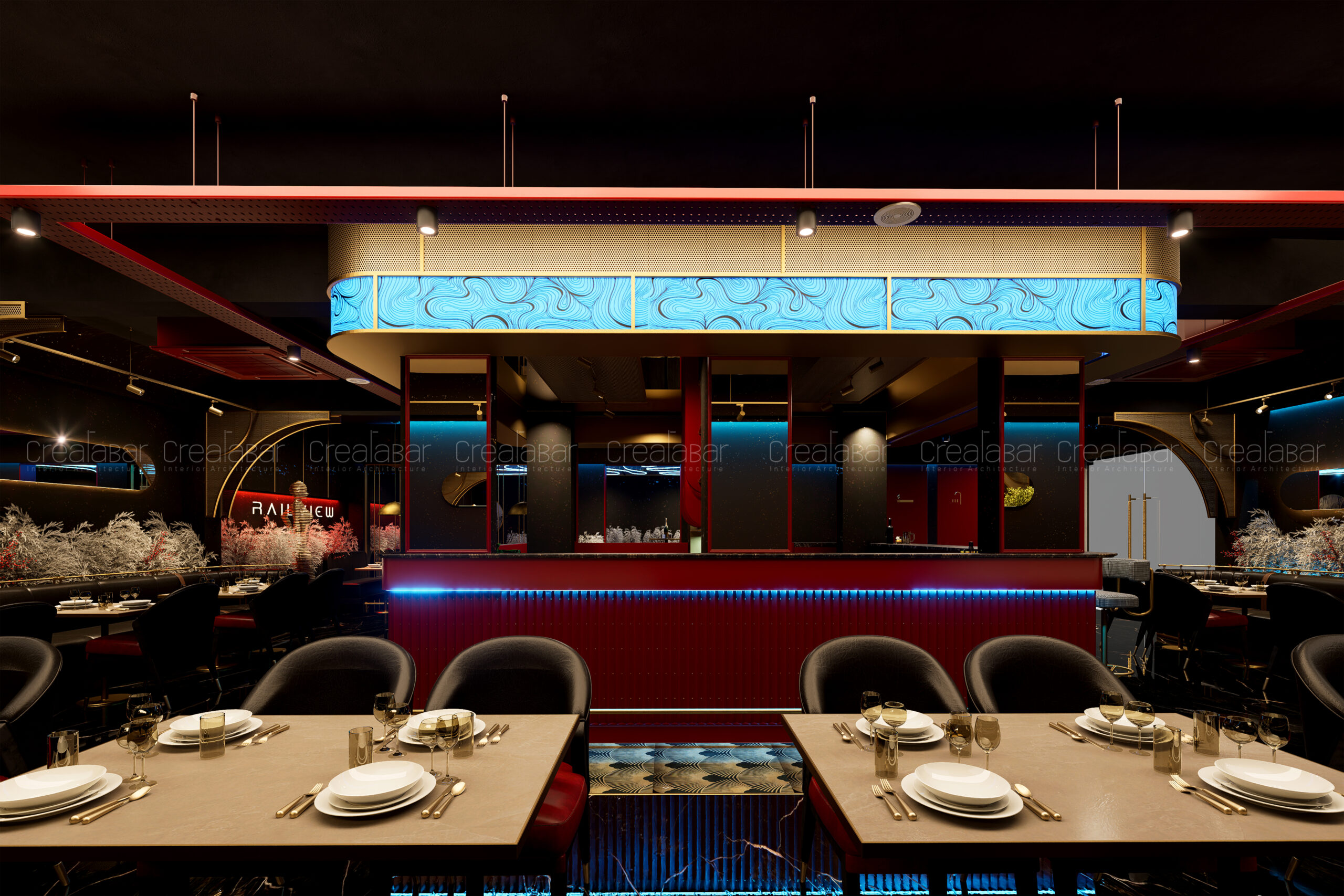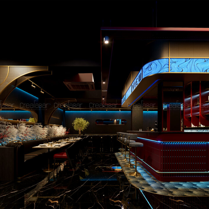 The bar functions as the spatial and social heart of the restaurant. Positioned centrally, it anchors the layout and offers 360-degree visibility. Illuminated counters, textured cladding, and overhead feature elements make it a strong visual focal point while encouraging interaction and movement around it.