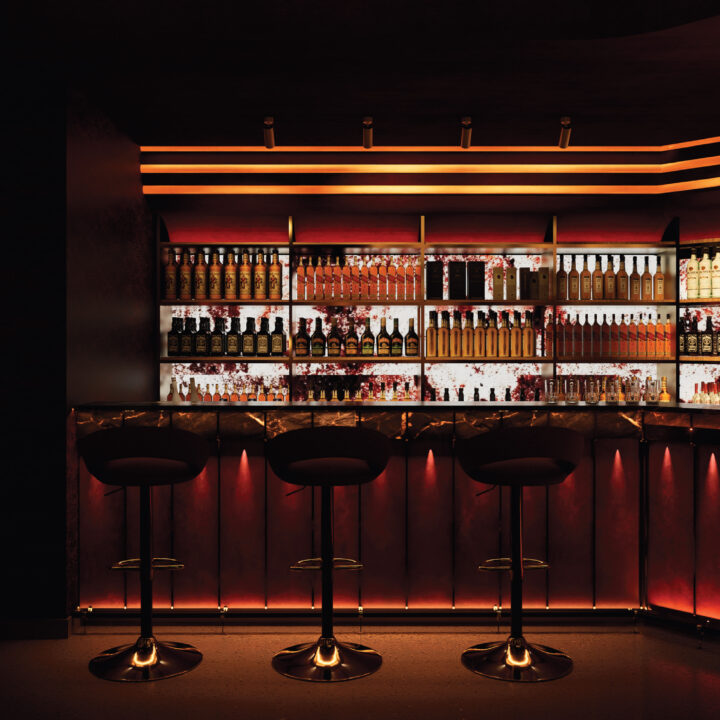 The core concept is cinematic luxury with fluid motion. Inspired by movement and travel, the space uses flowing forms, reflective surfaces, and dynamic lighting to create a sense of depth and continuity. Strong contrasts—dark backgrounds paired with glowing accents—establish a theatrical atmosphere, while curated details ensure the space feels intentional rather than overwhelming.