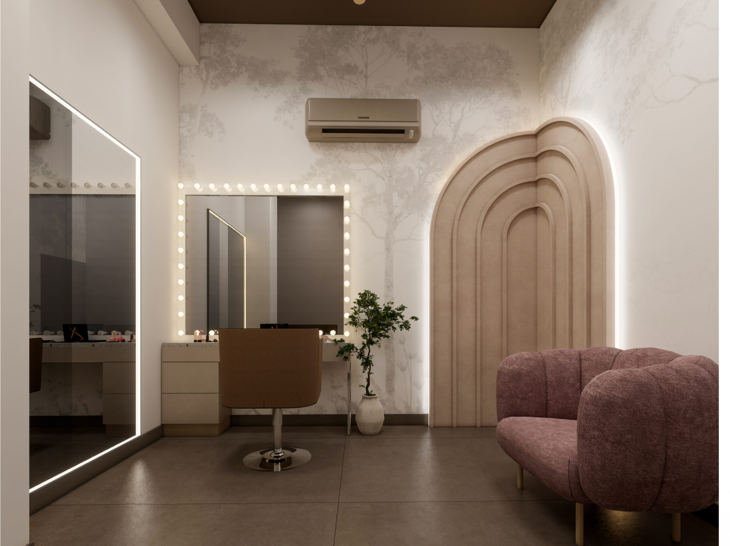 The concept revolves around soft luxury and visual balance, using clean lines, warm neutrals, and subtle metallic accents. Curved forms and layered lighting introduce elegance, while transparency and openness ensure spatial continuity.