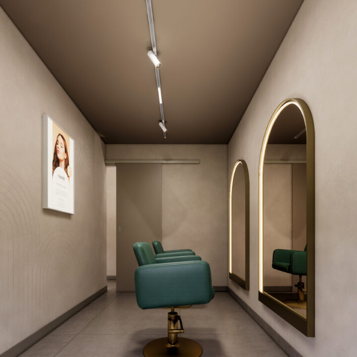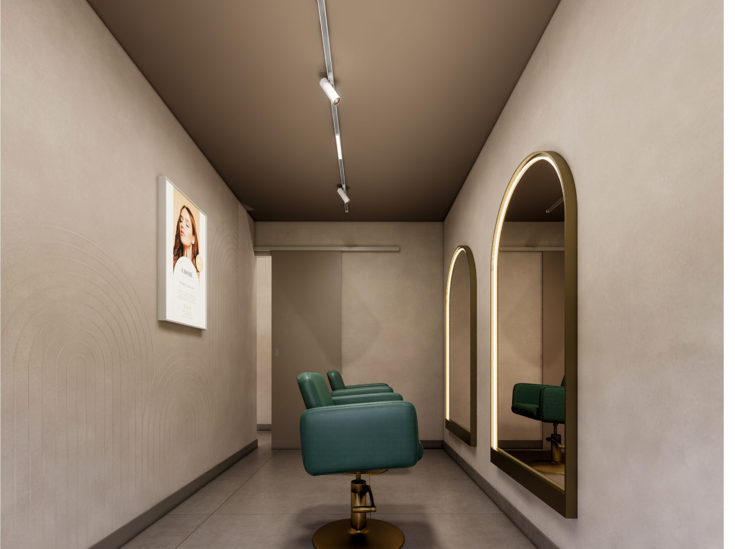 Organized in linear bays with illuminated mirrors, ergonomic chairs, and mobile styling trolleys. The layout ensures efficient workflow, privacy, and visual symmetry.
